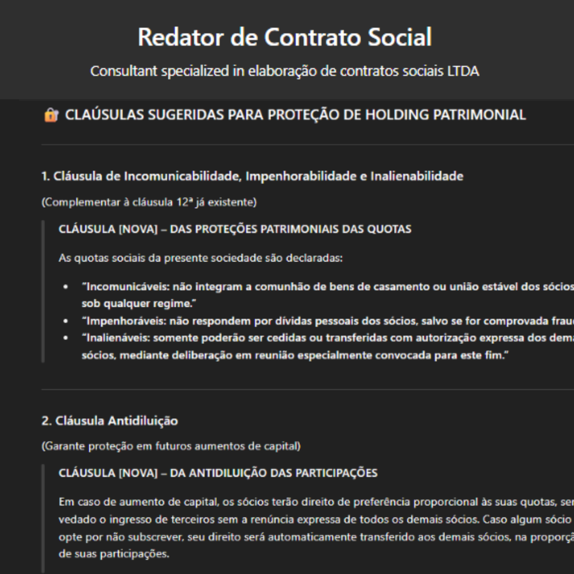 Gere contratos sociais prontos para registro, valide informações e reduza retrabalho em alterações societárias.