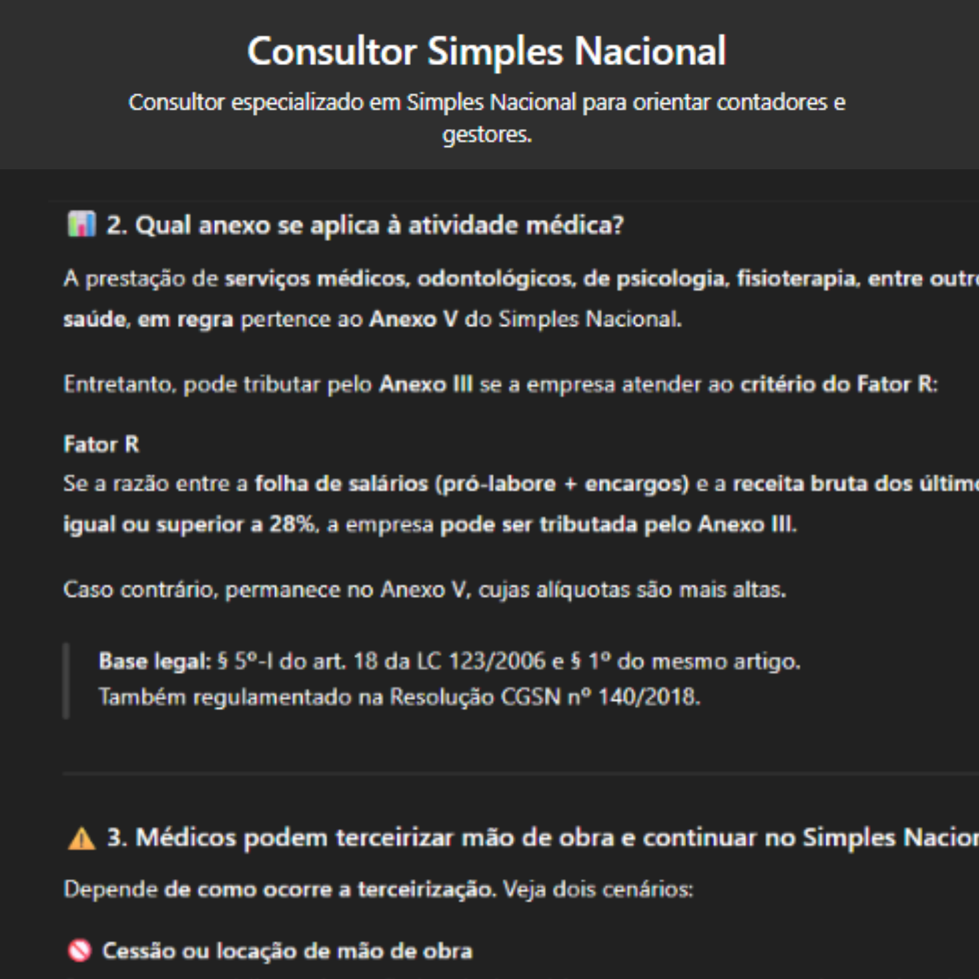 Automatize análises tributárias, simule cenários fiscais e oriente empresas sobre vantagens e riscos do Simples com precisão.